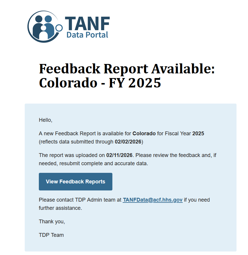 We'll also notify you if your request is denied. Should this happen and you believe it to be in error please let us know by reaching out to TDP support at TANFdata@acf.hhs.gov..